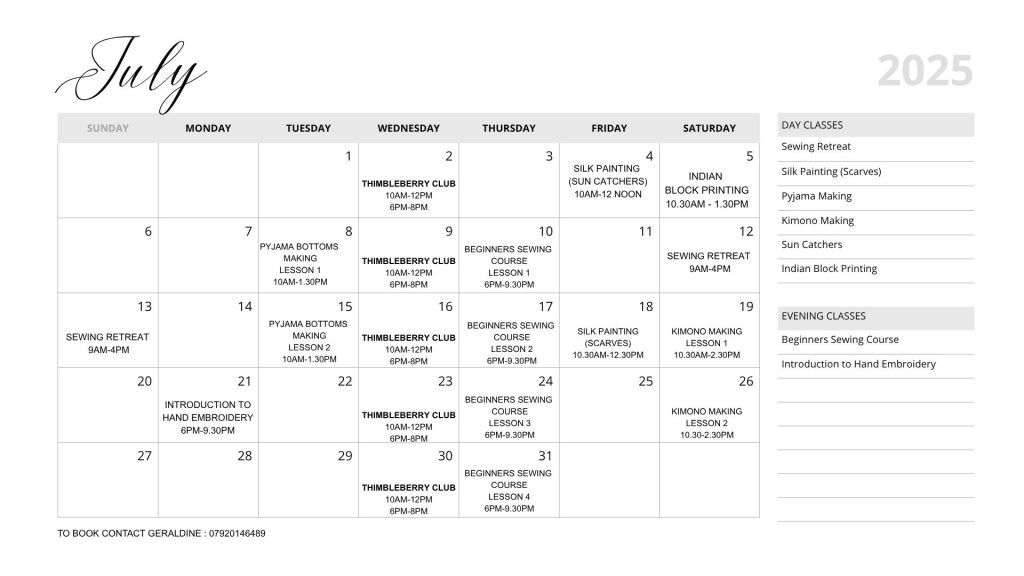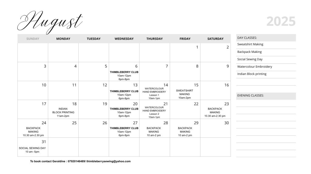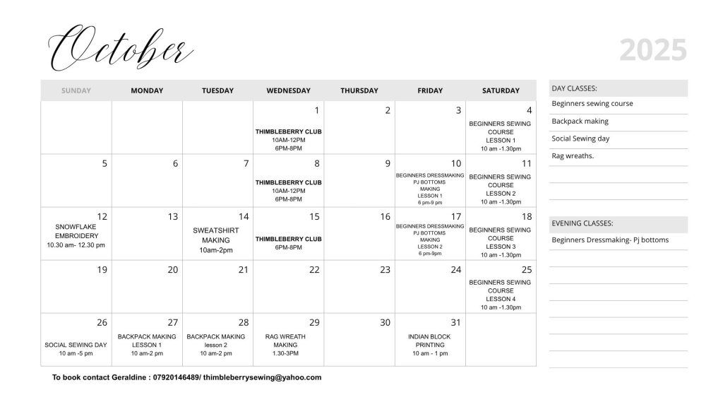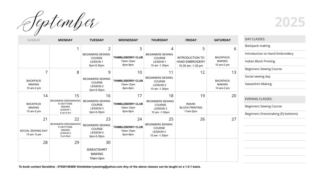 To book/enquire contact Geraldine email: thimbleberrysewing@yahoo.com Tel: 07920146489. Can’t find a date that suits? No problem, all classes can be taught on a 1-2-1 basis from £20/hour. Group bookings are also available on request.