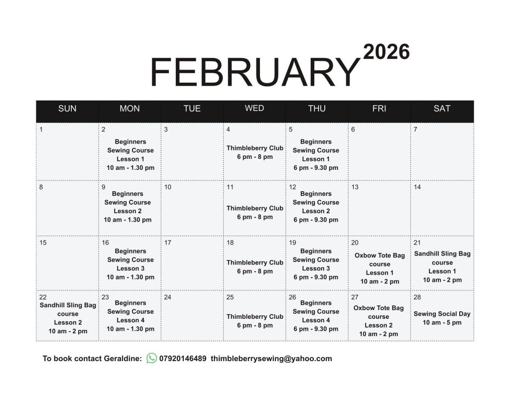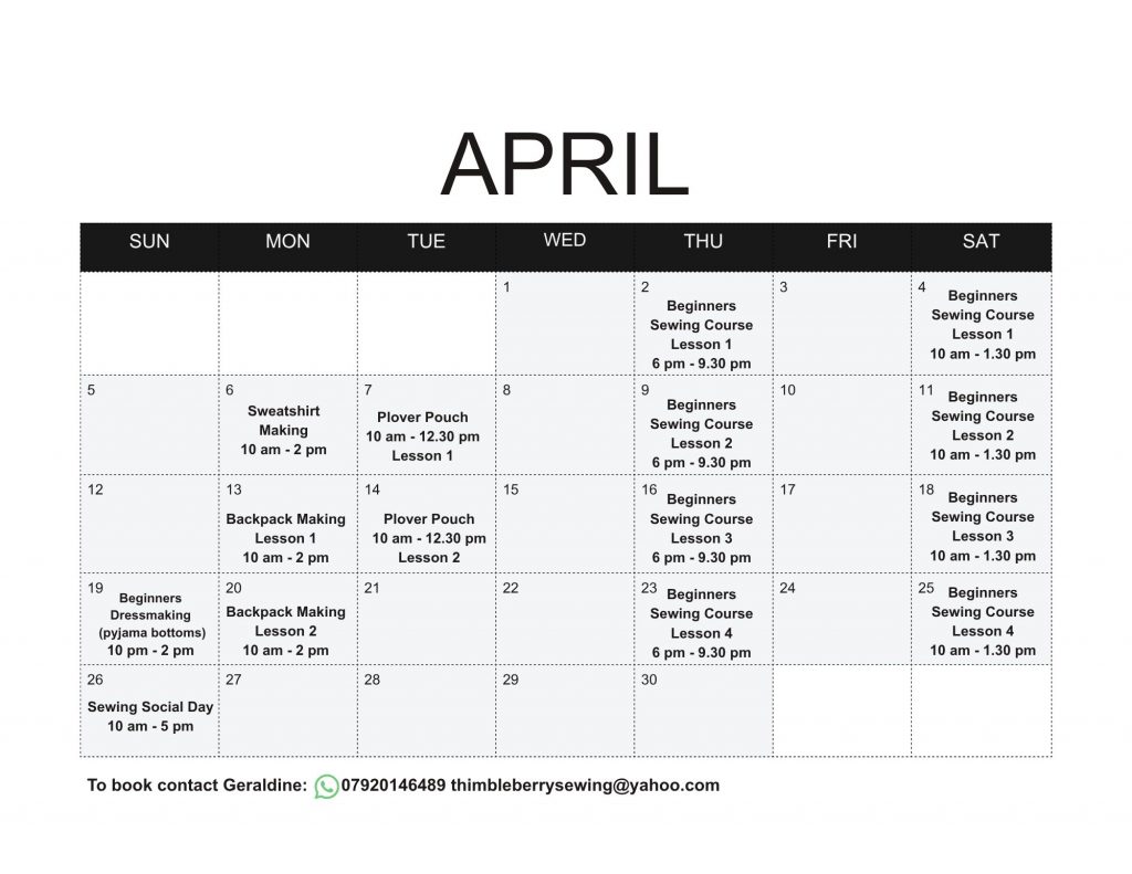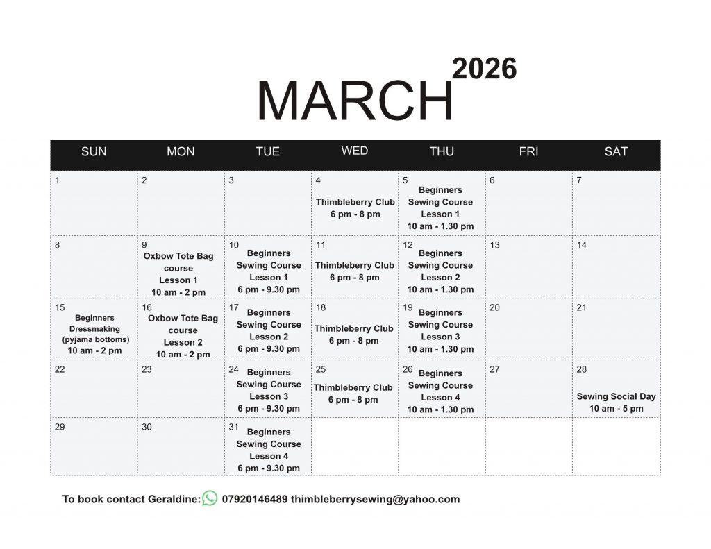 To book/enquire contact Geraldine email: thimbleberrysewing@yahoo.com Tel: 07920146489. Can’t find a date that suits? No problem, all classes can be taught on a 1-2-1 basis from £25/hour. Group bookings are also available on request.