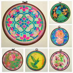 Pre-gutta outlined designs will be provided and displayed in an embroidery hoop for easy hanging.